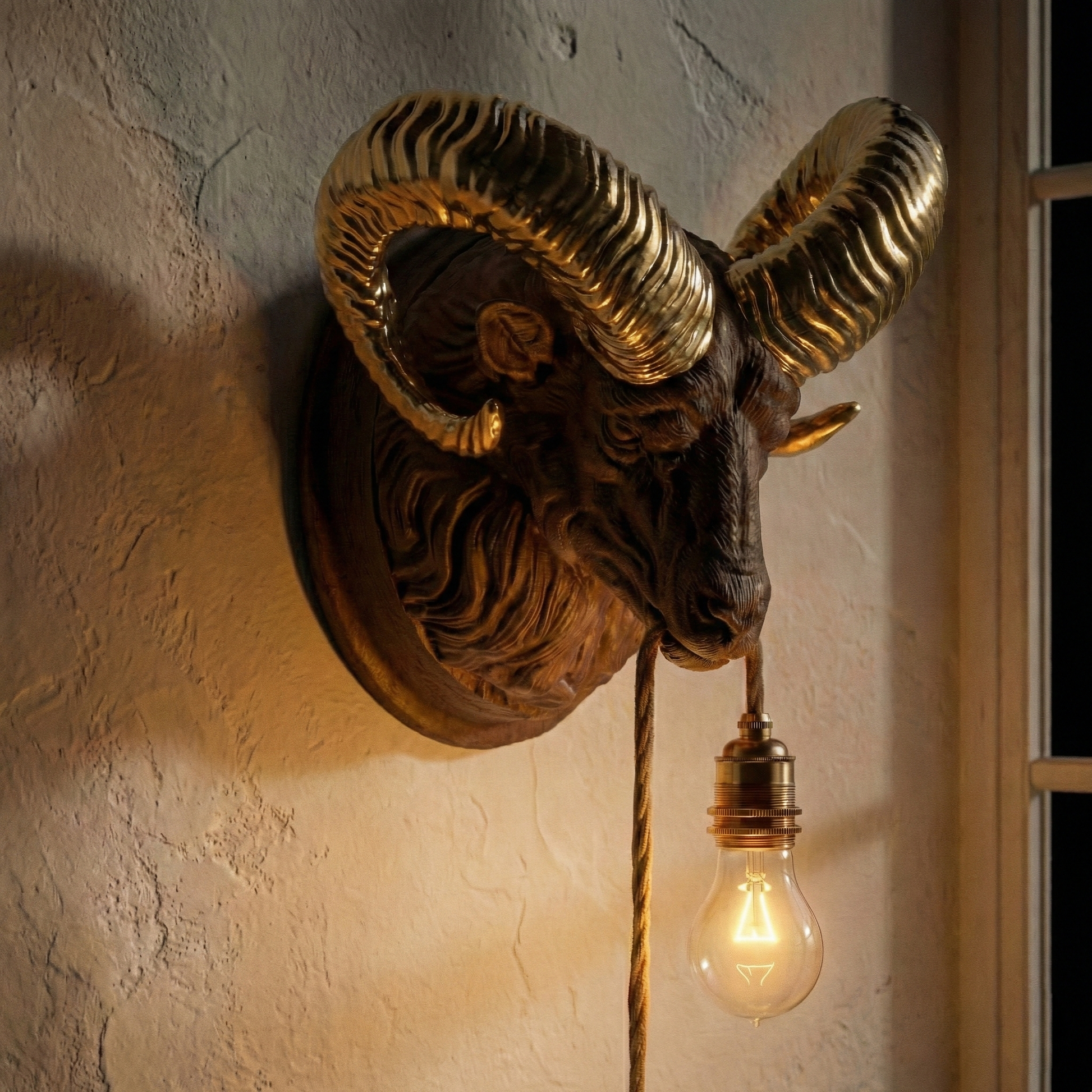 Sculpture wall art depicting a ram, made with 3D sculpture and printed in PLA (Recycled Biodegradable Polylactic) and with 30% wood fibres, 2-metre long organic rope-covered electric cable, with bronze-plated steel lamp holder and internal ceramic.