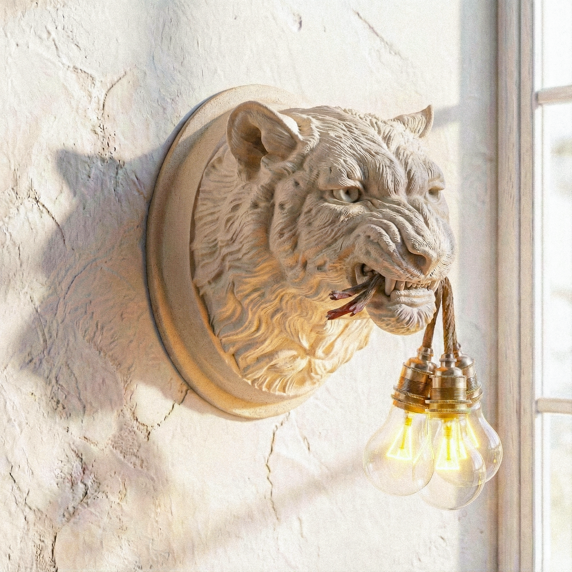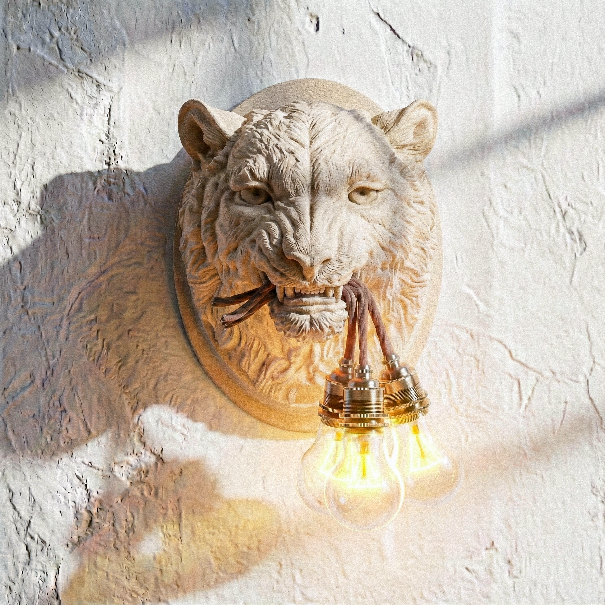 Scultura da tavolo raffigurante leopardo, realizzata con la scultura 3D e stampata in PLA (Polilattico Biodegradabile Riciclato) e 30% Fibre di Legno, cavo elettrico rivestito in corda organica lungo 2 metri, con portalampada in acciaio placcato bronzo e ceramica interna.